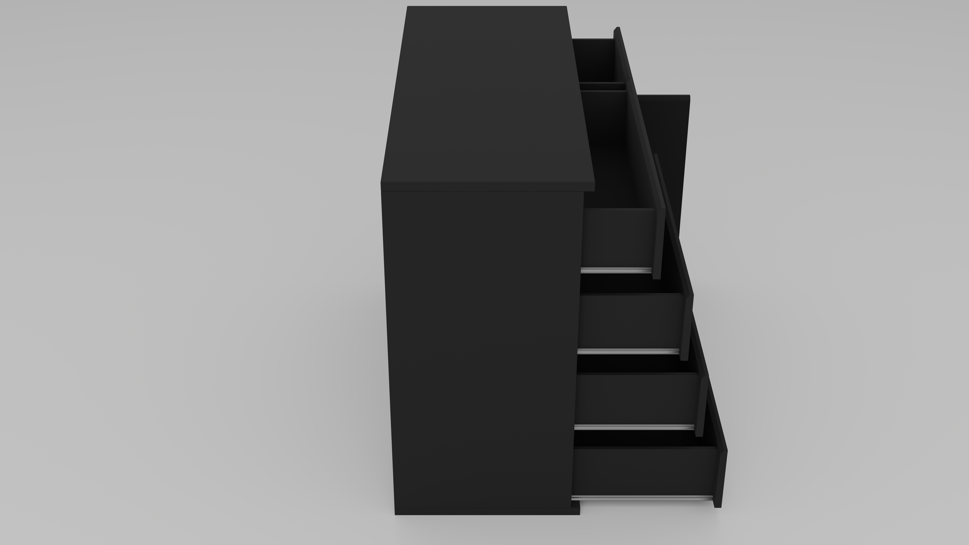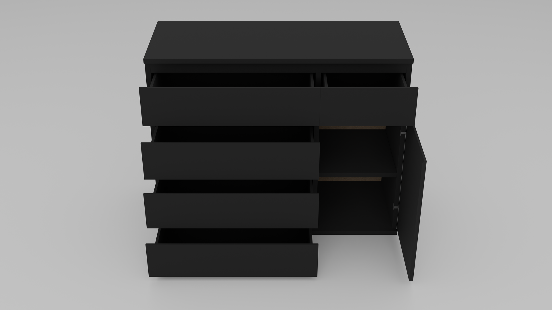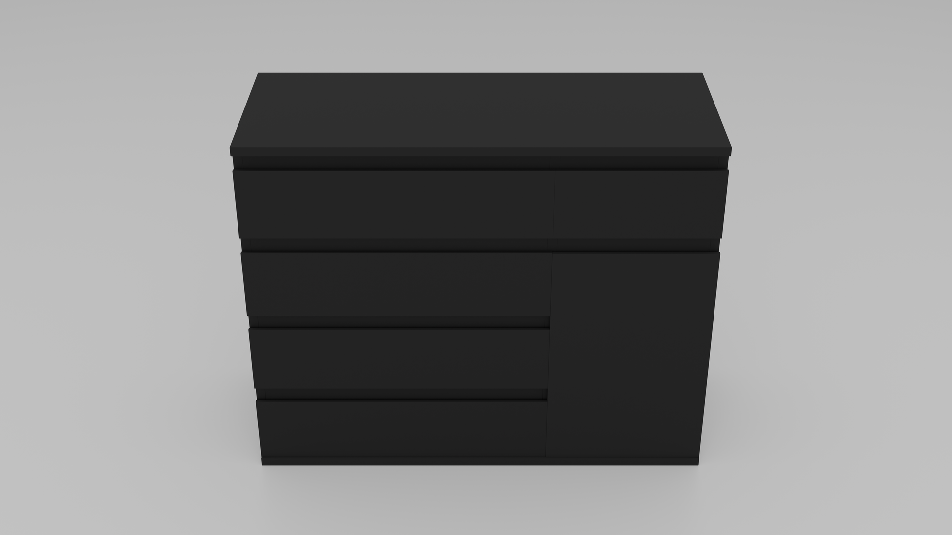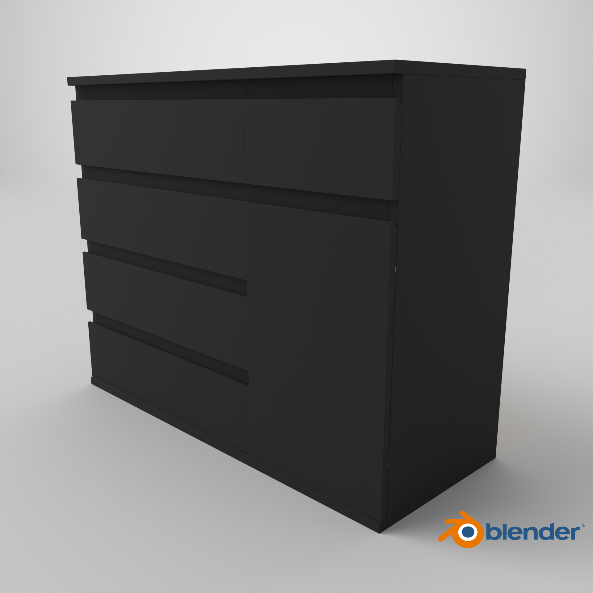 Kommode Variante 1: Schwarz Matt ist eine realitätsnahe 3D-Nachbildung basierend auf den Originalmaßen. Das Modell präsentiert sich in elegantem Schwarz Matt und umfasst 4 große Schubladen, 1 kleine Schublade sowie eine Tür mit Einlegeboden. Alle Schubladen und die Tür sind einzeln animierbar und beweglich, was es ideal für realistische Szenen und Interaktionen macht. Die saubere Topologie macht das Modell perfekt für Visualisierungen, Echtzeit-Rendering und virtuelle Umgebungen.
