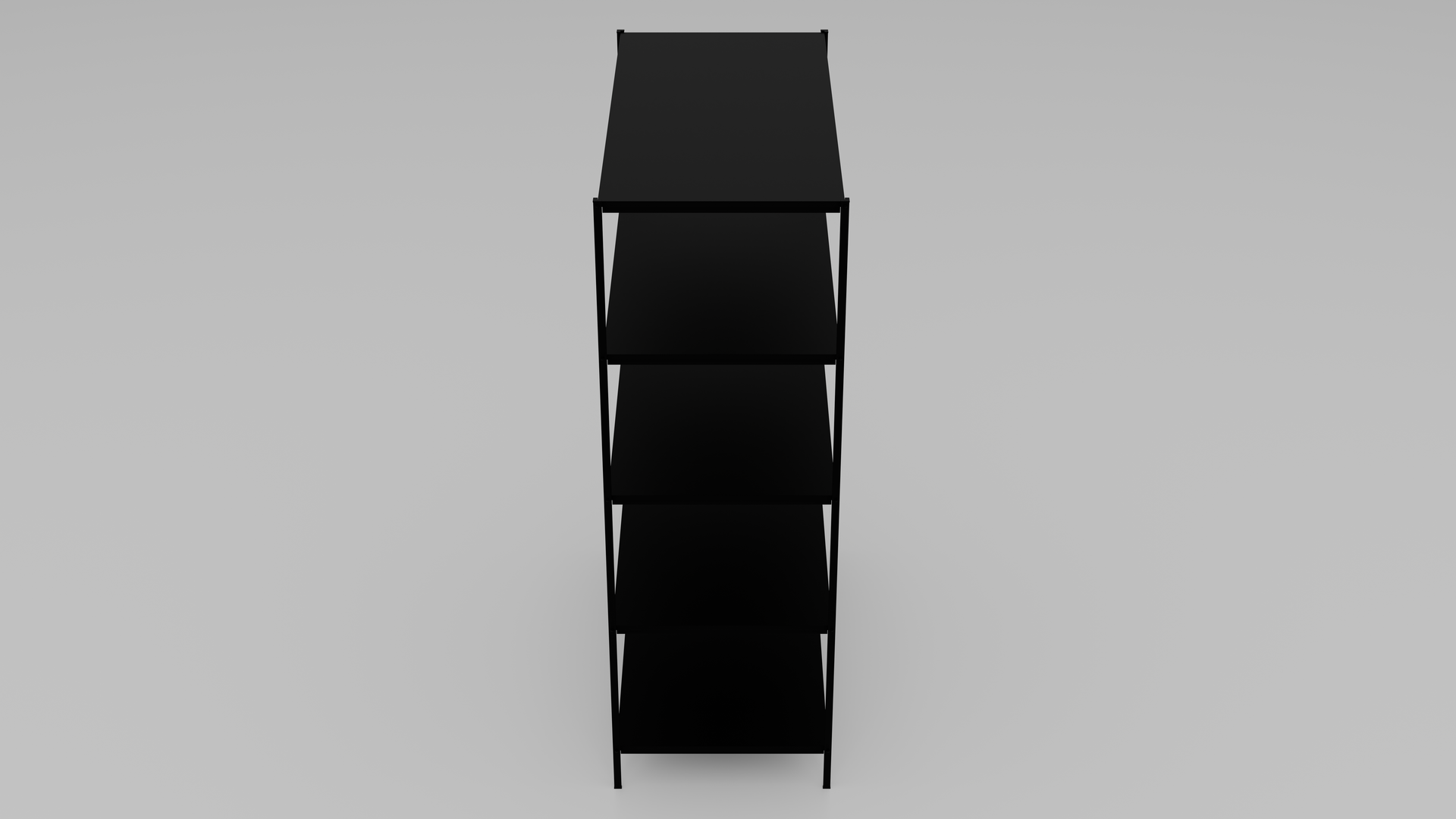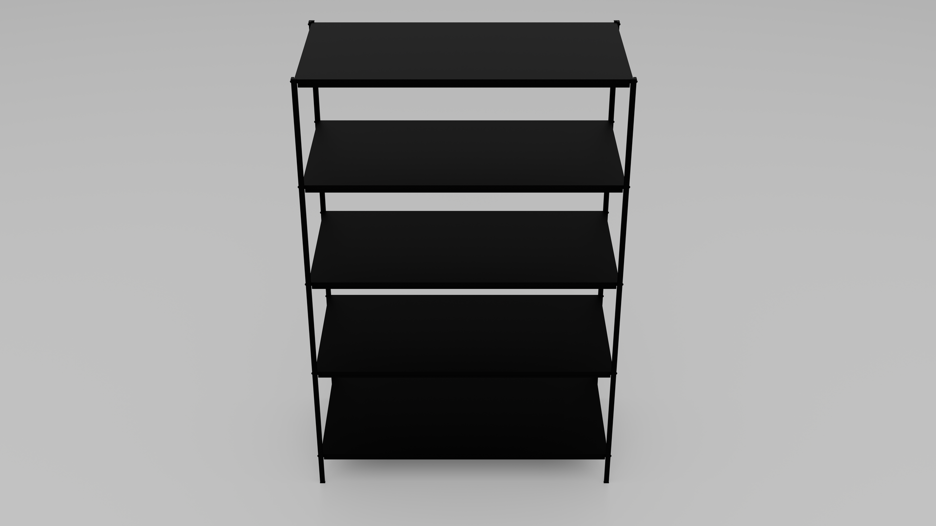 Das Regal besteht aus schwarzem Metall und verfügt über 5 große Einlegeböden.