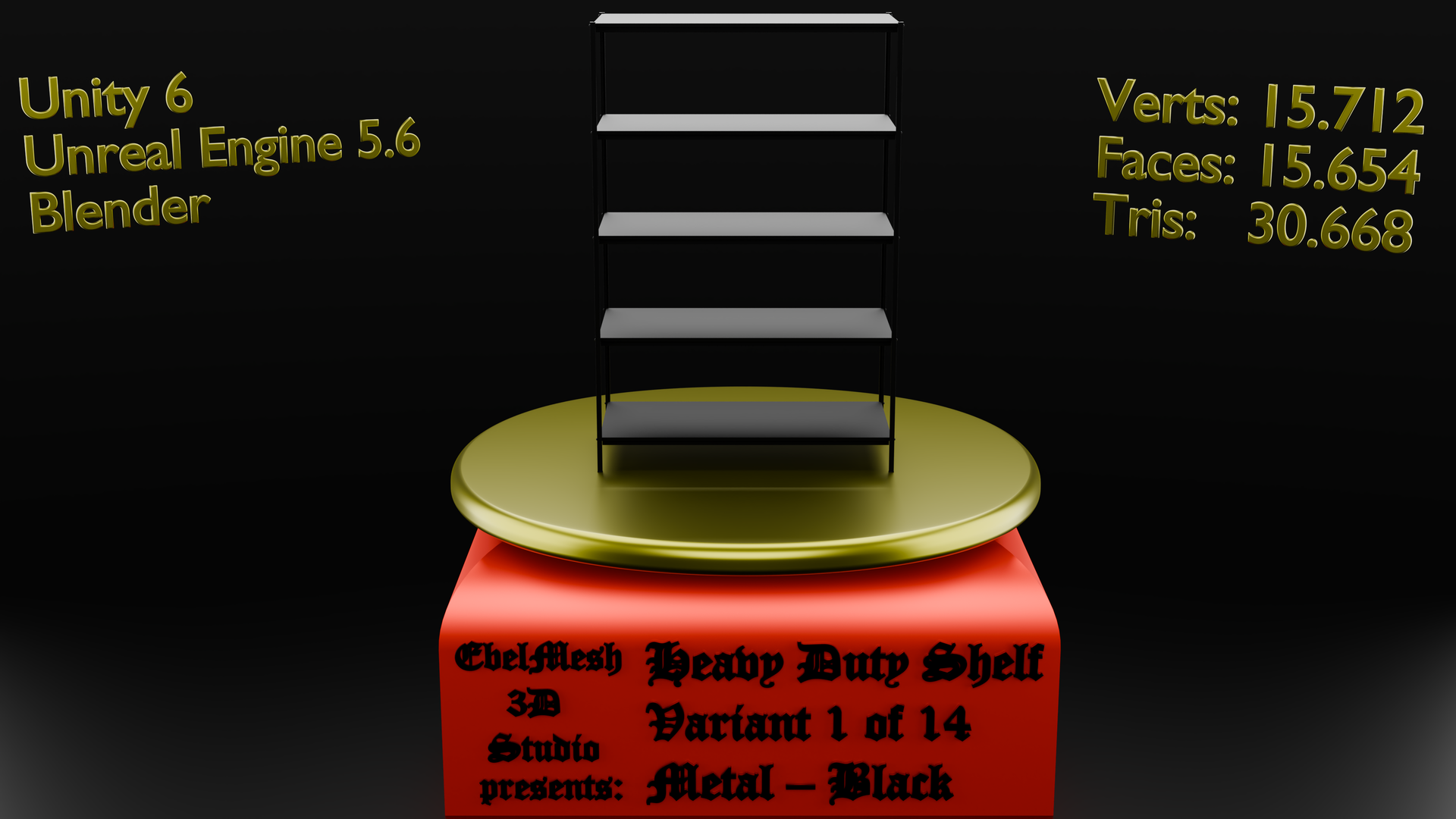 3D-Schwerlastregal aus schwarzem Metall mit 5 Einlegeböden – maßstabsgetreu, modular und visualisierungsbereit. Bereit für Unity 6 und Unreal Engine 5.6.
