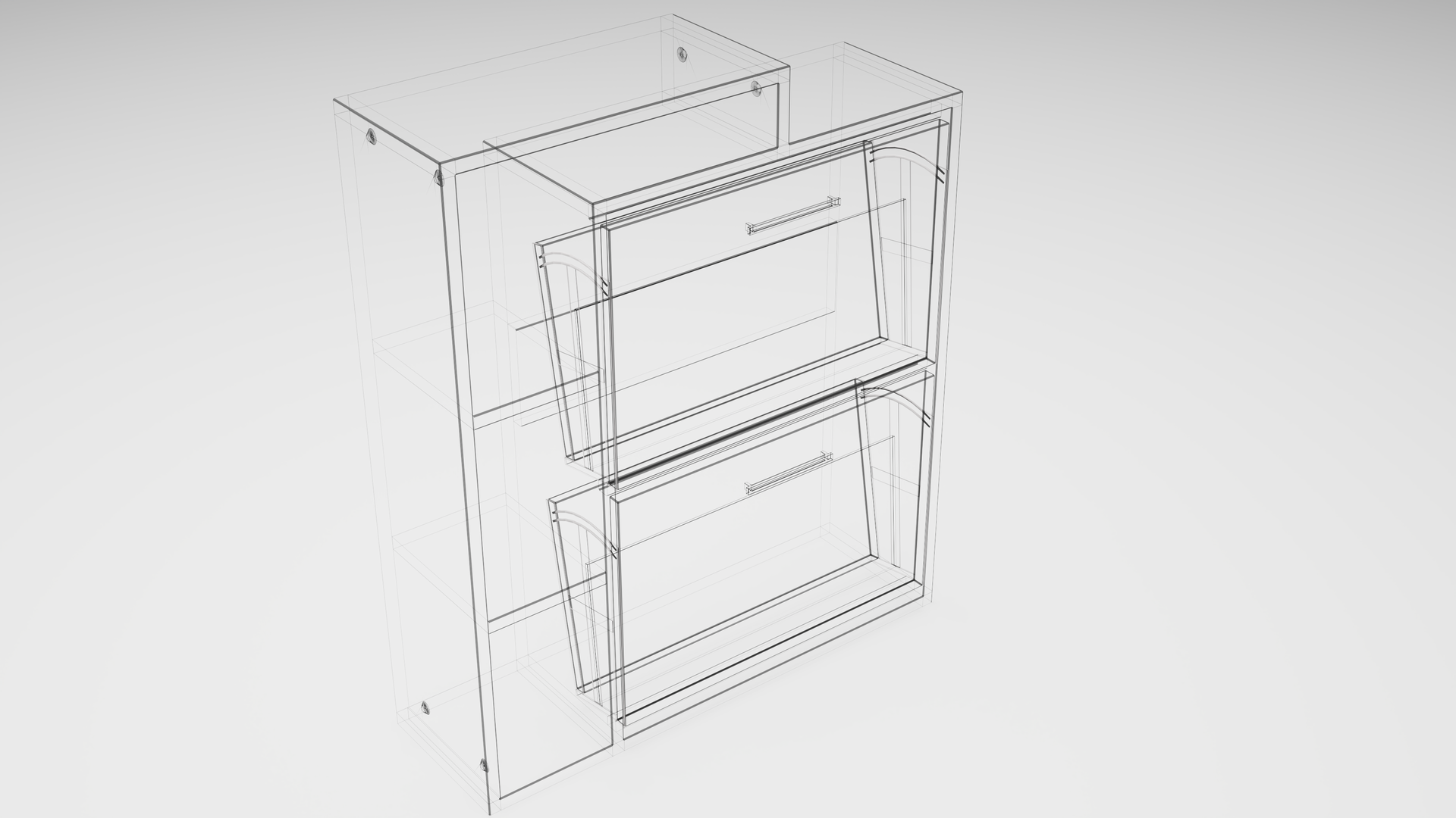 Dieses 3D-Modell zeigt einen modernen Garderoben-Schuhkipper in elegantem Schwarz Matt. Das Modell verfügt über zwei kleine Einlegeböden neben den Türen, ideal zur Aufbewahrung kleinerer Gegenstände. Zusätzlich gibt es zwei große Kipper-Türen, die sich nach vorne öffnen lassen und reichlich Stauraum für Schuhe bieten. Klare Linien und die matte Oberfläche betonen das zeitlose, minimalistische Design.
