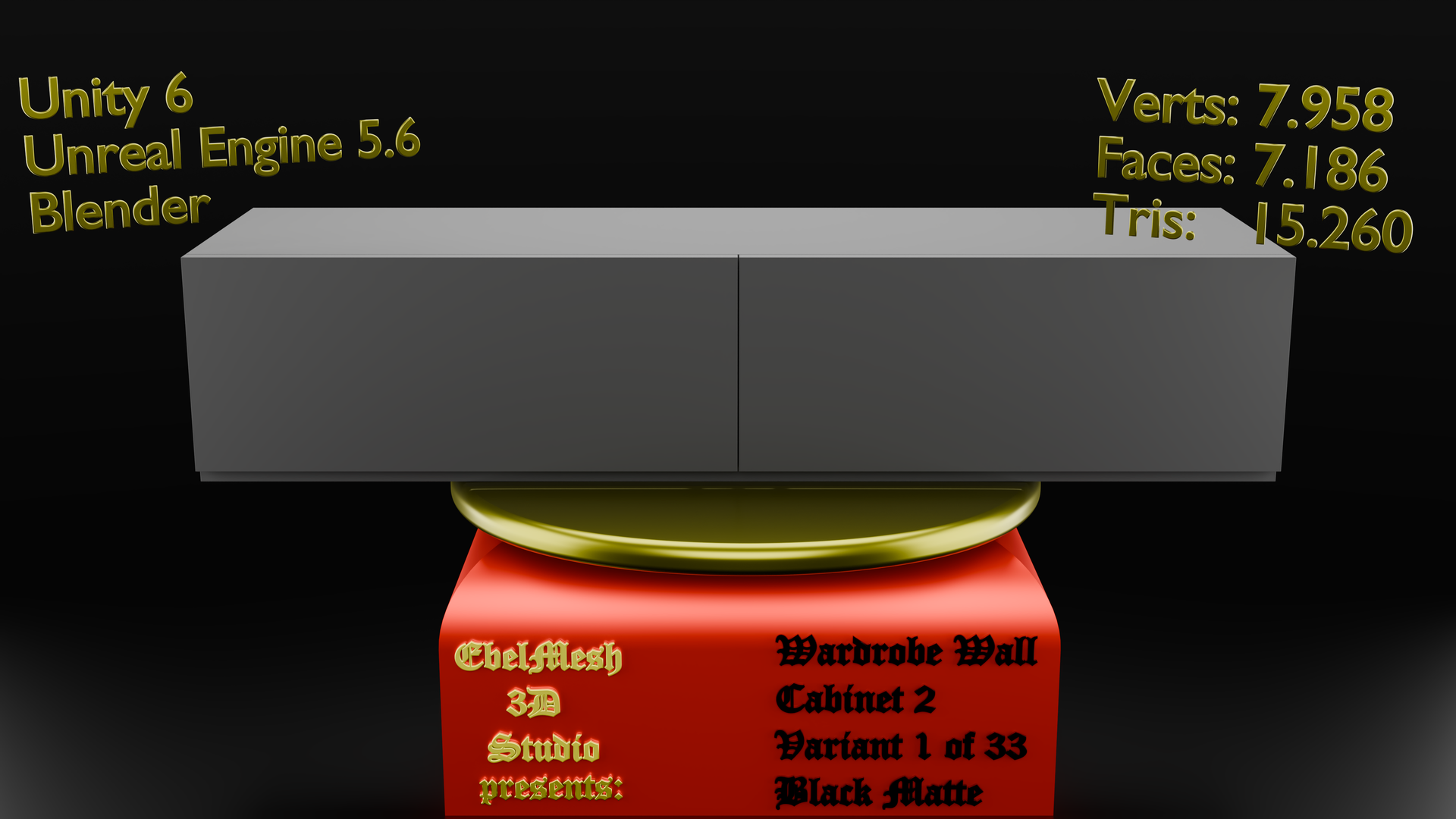 Unsere zweite Version, einzeln, präsentiert unser 3D-Modell in einem stilvollen, modernen Design – ein wandmontierter Schrank in elegantem Schwarz Matt. Der Schrank ist wandmontiert und verfügt über realistisch modellierte Scharniere und Schrauben, die sowohl optisch als auch funktional integriert wurden. Das Modell eignet sich ideal für Innenraumvisualisierungen, Möbelplanungen oder Produktpräsentationen mit Fokus auf modernes Design und hochwertige Details.